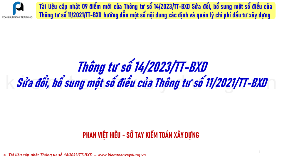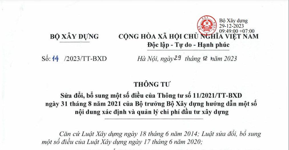 Thông tư số 14/2023/TT-BXD Sửa đổi, bổ sung một số điều của Thông tư số 11/2021/TT-BXD hướng dẫn một số nội dung xác định và quản lý chi phí đầu tư xây dựng